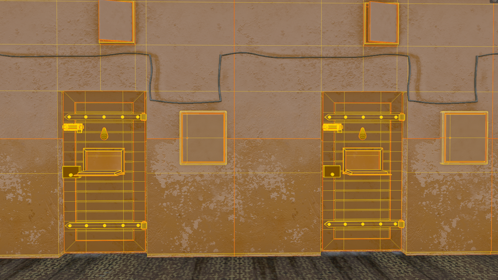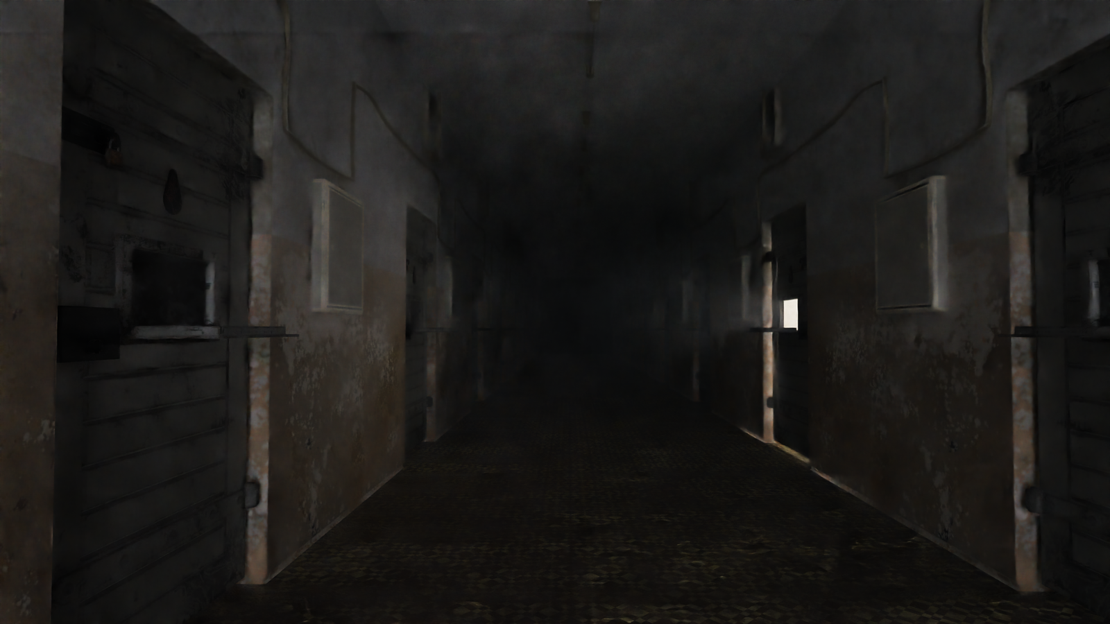 The corridor is built as a dark, monotonous prison space, defined by repetition and worn surfaces that compress the frame.