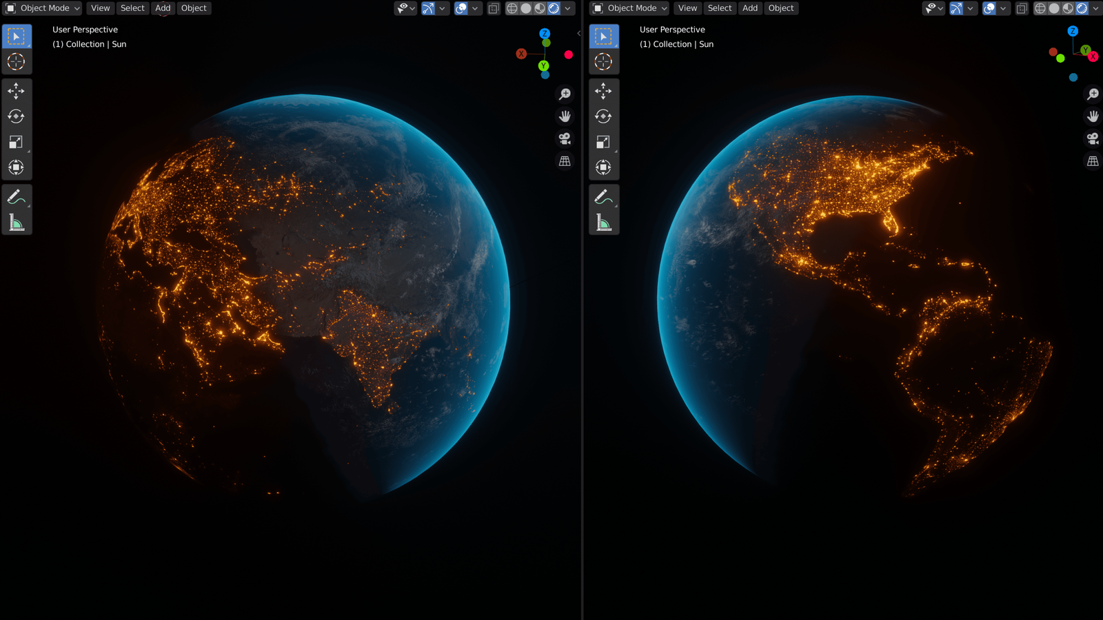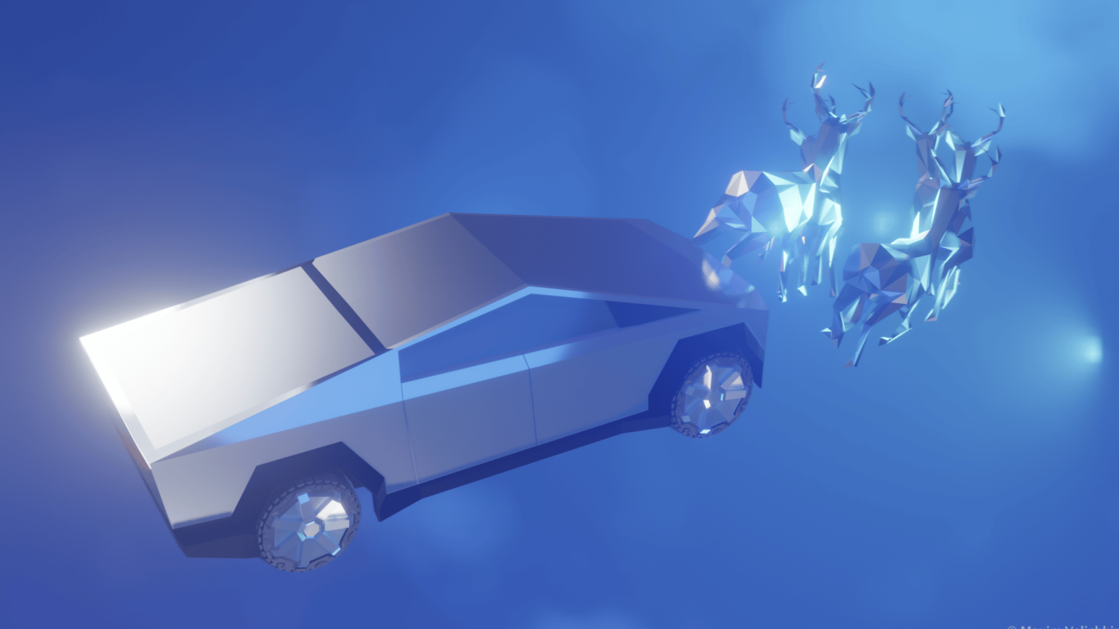 The project combines hard-surface modeling, character-style rigging, and an atmospheric final scene: a stylized vehicle led by a low-poly reindeer team, drifting through volumetric clouds above Earth with dynamically changing night lights. It was created as a New Year greeting, primarily focused on tone, rhythm, and a bit of winter magic.
