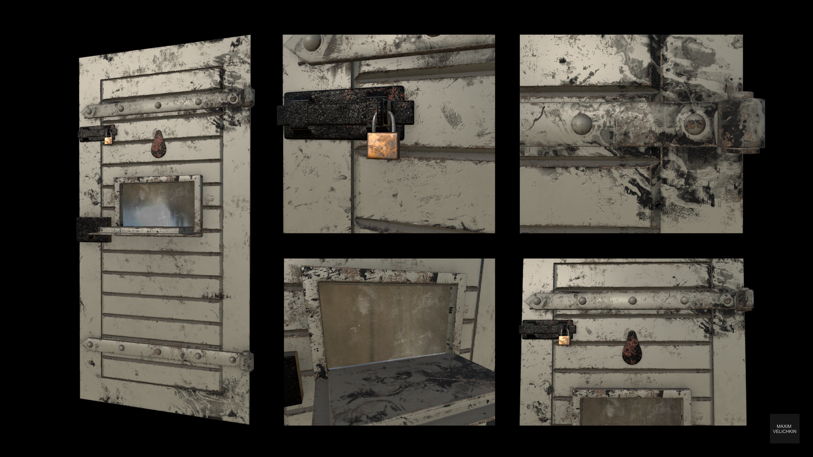 Close-ups focus on the cell door and hardware. Rust, chipped paint, damp stains, traces of black mold, and layered grime define the surface, giving the door a heavy, neglected presence.