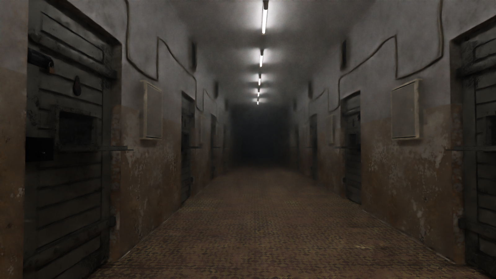 The corridor is built as a dark, monotonous prison space, defined by repetition and worn surfaces that compress the frame.